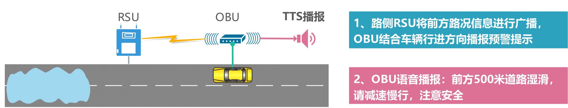 车辆内置OBU电子标签在接收到路侧设备发来的道路信息后,主动语音播报道路湿滑信息,提醒驾驶员减速慢行。